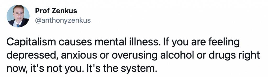 In another tweet made on the same day, Zenkus–who teaches social work–claimed that “Psychiatry is a tool of inequality. Capitalism creates conditions that make us sick, then it manufactures pills they tell us will make us well.” To this claim, Zenkus provided support not in the form of a TEDTalk, but in the form of his own anecdotal evidence.