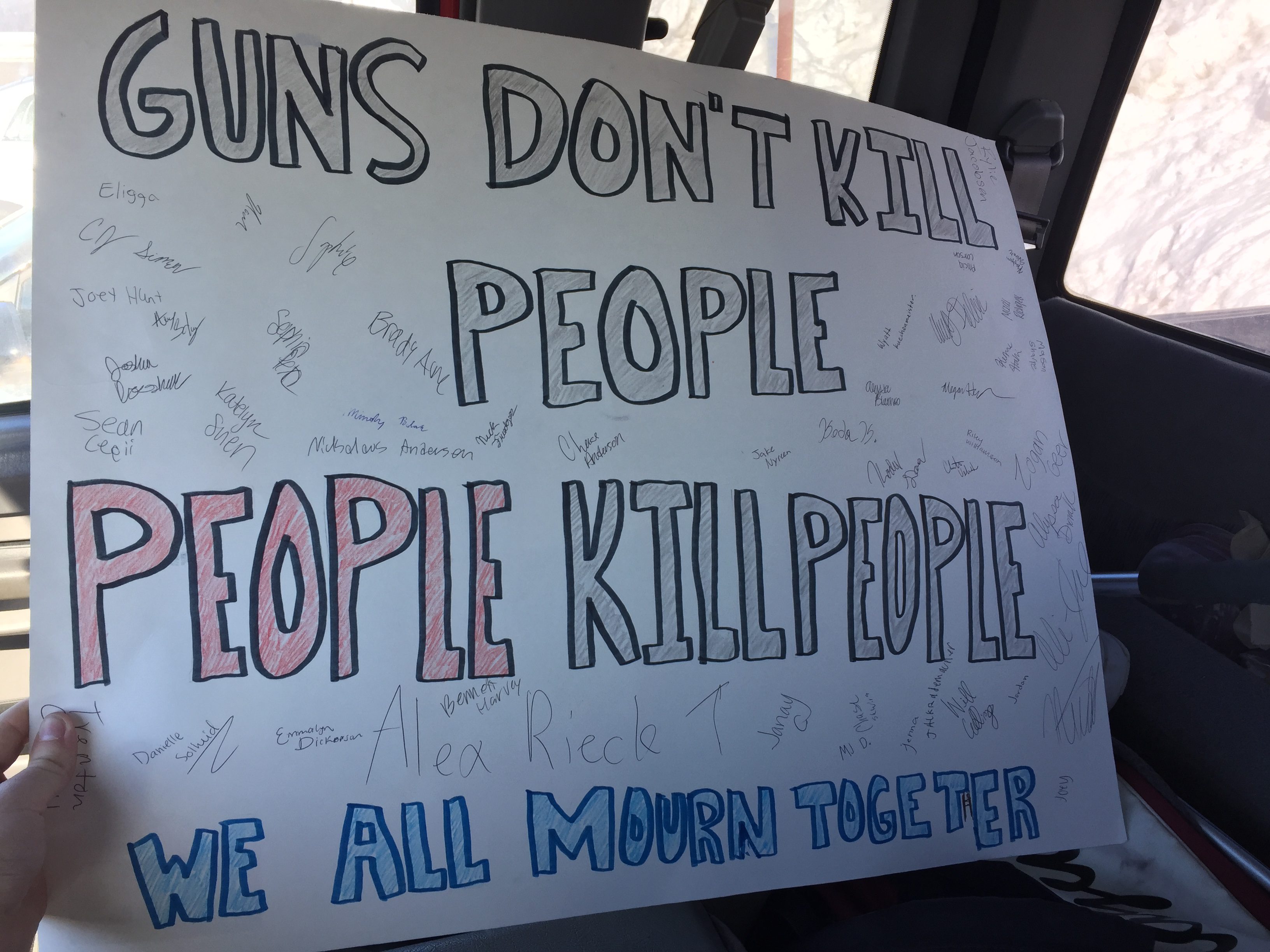 It read: “Guns don’t kill people, people kill people. We all mourn together.”