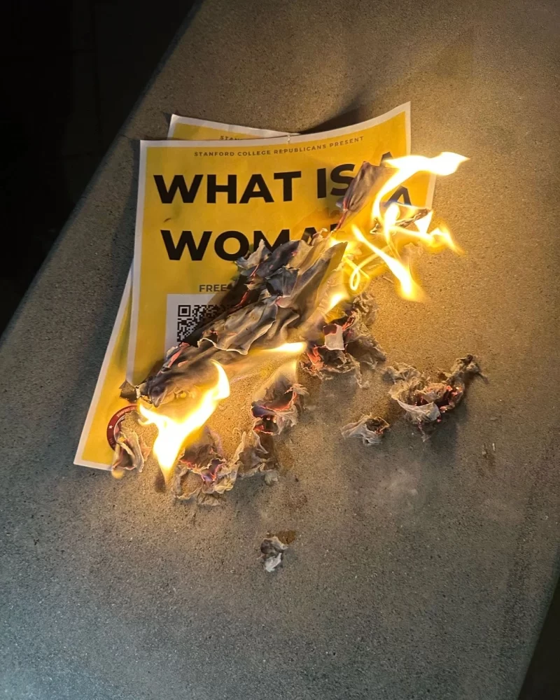 On Thursday evening, an anonymous person posted pictures of flyers promoting Walsh’s “What is a Woman?” lecture being burned to a Stanford social media forum.