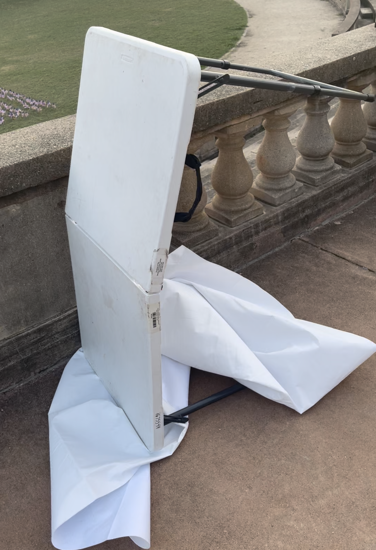 Ryan also claimed the table, photographed as having been completely flipped over, was knocked over as a result of the wind. “There was also a suggestion that the table used in the ceremony was flipped over in anger. The video instead shows someone picking up the table long after the ceremony was over (which means there was nothing on the table), putting the table on its side and folding down a leg. As the officer reports, the person ‘lifted the table in a gentle manner and did not forcefully flip the table.’ The table does not appear to have been damaged,” he wrote.