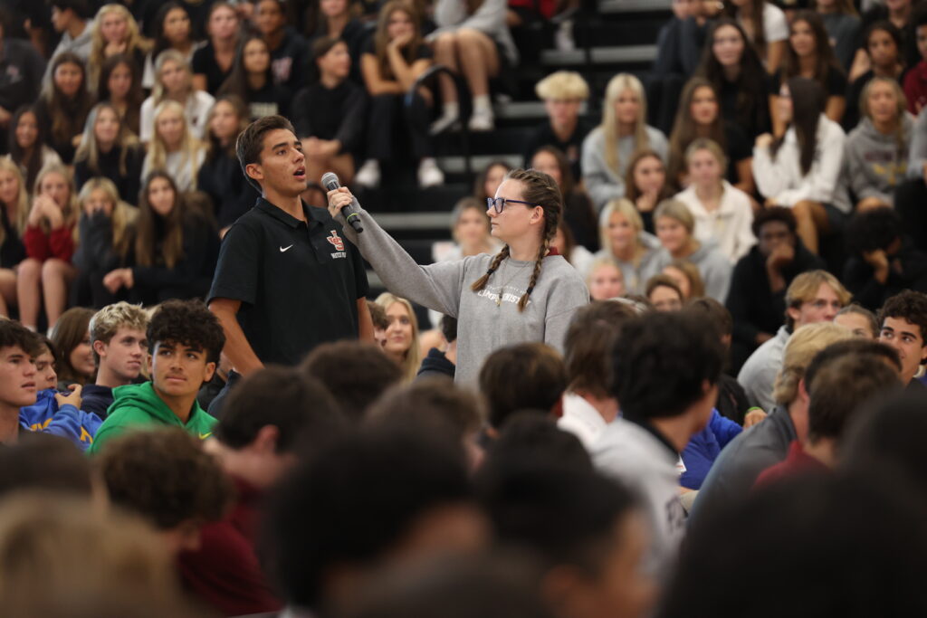 At the assembly, Coughlin spoke to students about how they can use satire, humor, and joy to fight back against cultural confusion. School administration encouraged students to engage with the ideas, not just put up a wall and not listen to what people are saying.