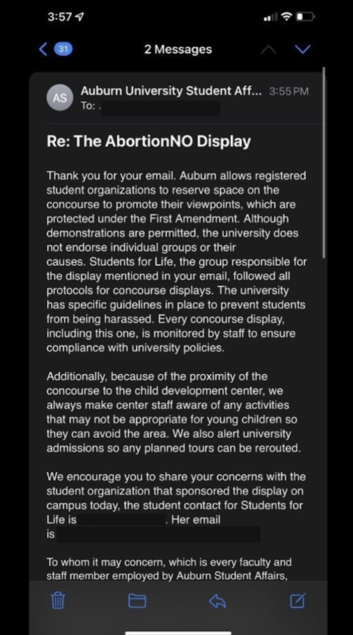“We encourage you to share your concerns with the student organization that sponsored the display on campus today,” Auburn’s Student Affairs office wrote in an email obtained exclusively by YAF.