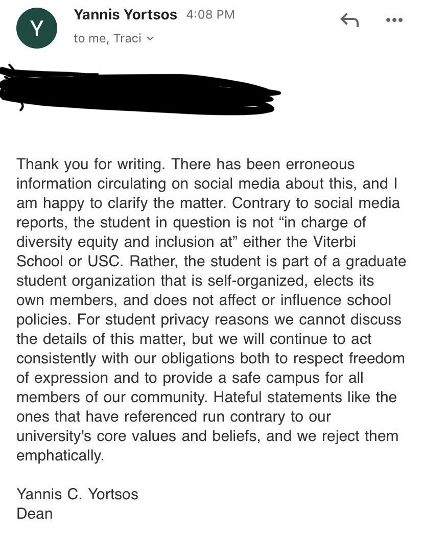 Dean of Viterbi, Yannis Yortsos reportedly downplayed both the student’s actions and position to alumni Emily Schrader in email correspondence, telling her “There has been erroneous information circulating on social media about this…”