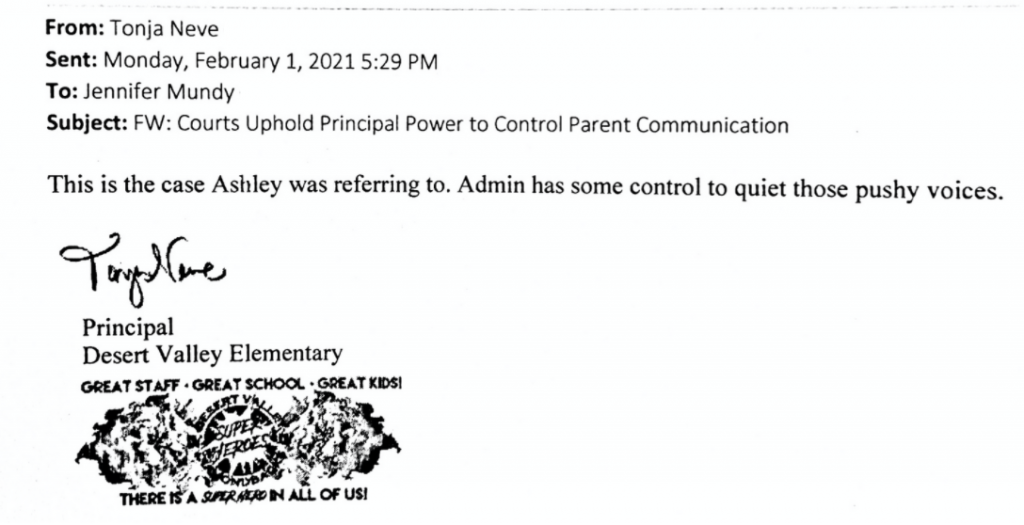 Neve also schemed with Jennifer Mundy, one of the architects of the new proposed curriculum, on how they could “quiet” “pushy voices” of dissenting parents, citing a recent circuit court decision that “reinforces the power of principals to set boundaries in parent-school communication.”