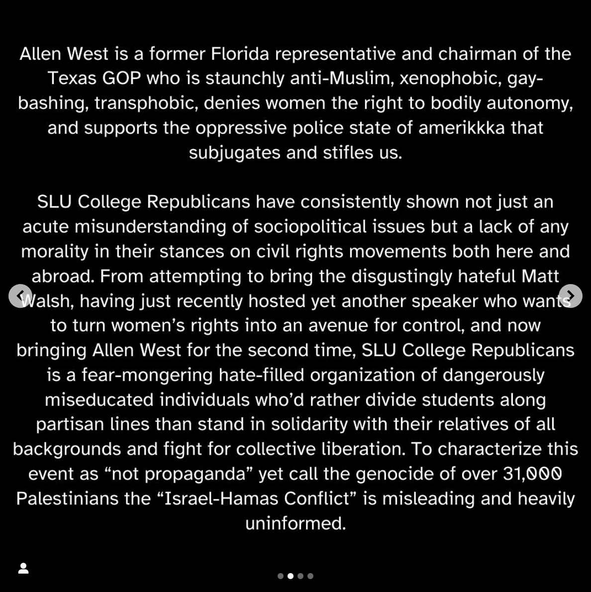 They go on to call the conservative students who invited West “dangerously miseducated individuals,” and called for the event to be canceled: “The Occupy SLU Coalition calls on SLU’s administration to stop Allen West from spreading ignorant hate speech at our university.”