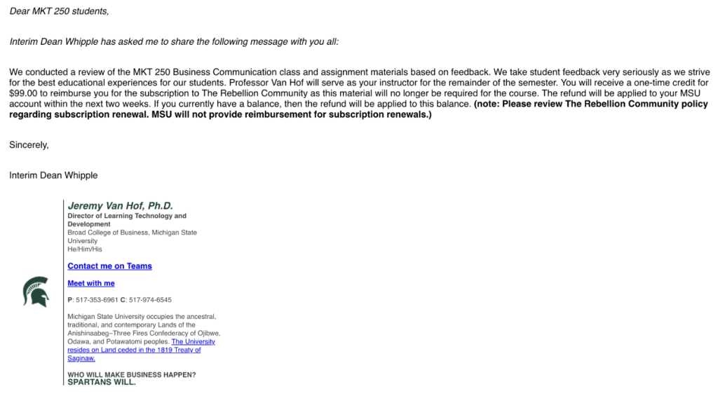 Wisner’s former students recently received an email from the business school’s interim dean informing them that the university will issue $99 account credits as reimbursements for their membership fees. The dean also warned students that they are responsible for canceling their automatically renewing subscriptions and will not be reimbursed by the school for any further charges.