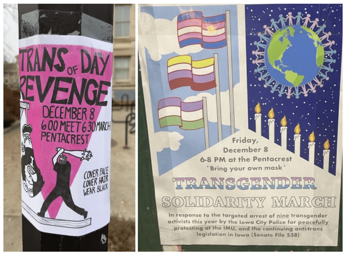 According to the postings, the event is planned “In response to the targeted arrest of nine transgender activists this year by the Iowa City Police for peacefully protesting at the [Iowa Memorial Union], and the continuing anti-trans legislation in Iowa”