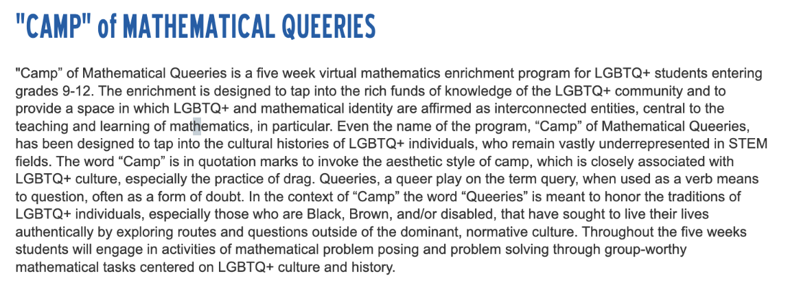 The Mathematical Association of America, a professional organization that counts undergraduate students, professors, and high school teachers among its members, is hosting a “Camp of Mathematical Queeries” for “LGBTQ+” 14 – 17 year-olds this summer.