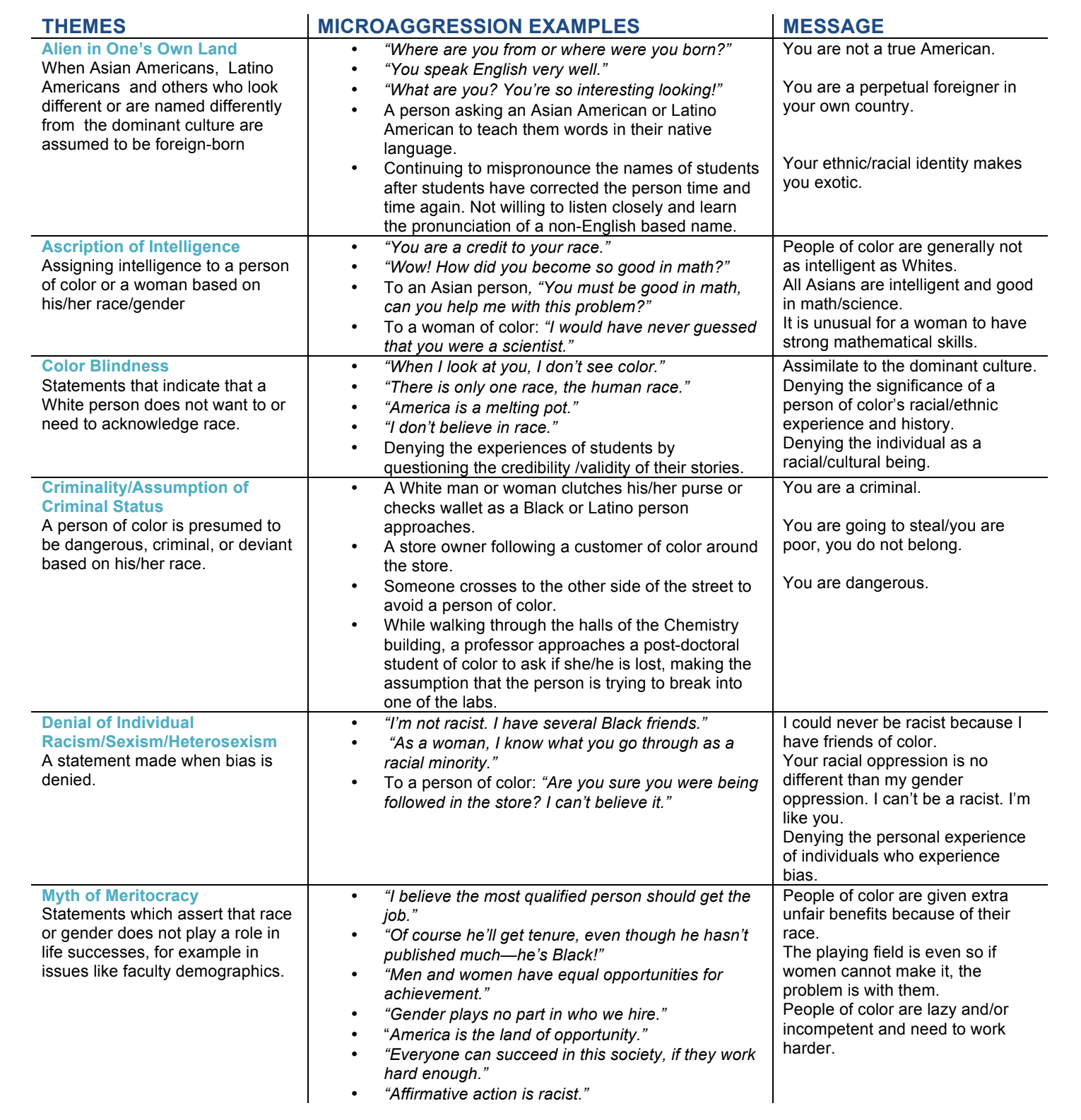 Some of the other microaggressions included, “Everyone can succeed in this society, if they work hard enough,” “Being forced to choose Male or Female when completing basic forms,” and “America is a melting pot.”