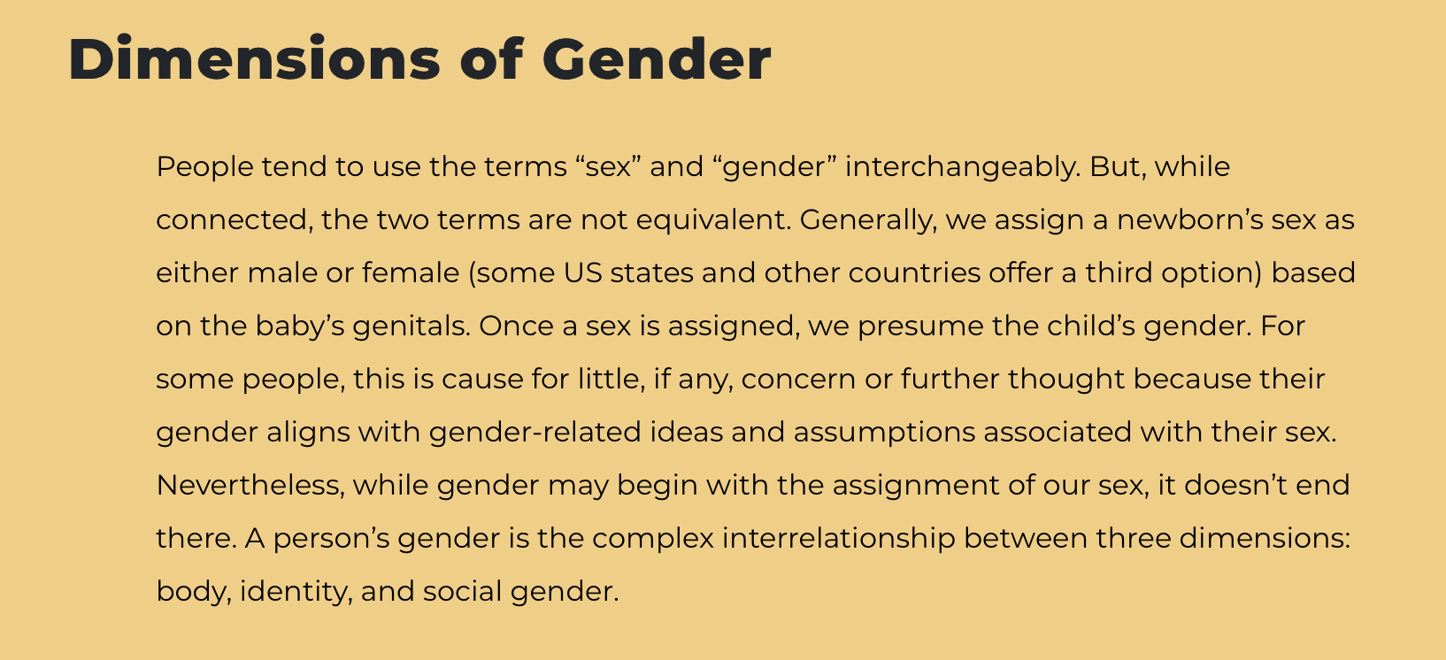 According to the website, “A person’s gender is the complex interrelationship between three dimensions: body, identity, and social gender.”