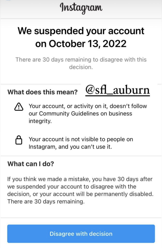 The student organization has sent an appeal to Instagram, which the company has 30 days to respond to.