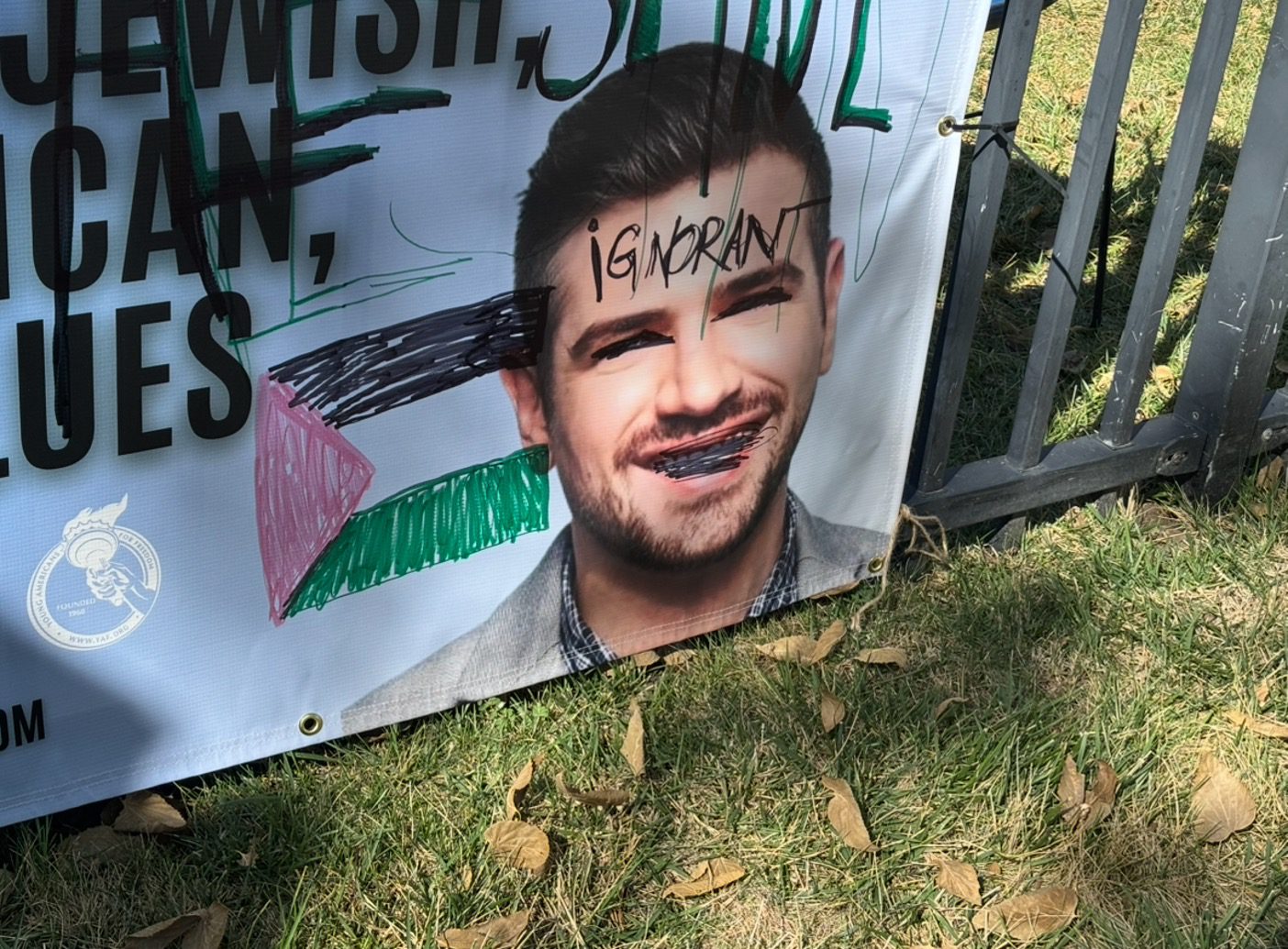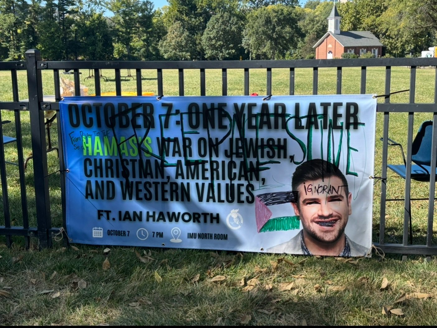 At 11:22 a.m., after attending class and work, YAF members discovered that their banner had been defaced with antisemitic phrases, including “From the River to the Sea” and “Free Palestine.”