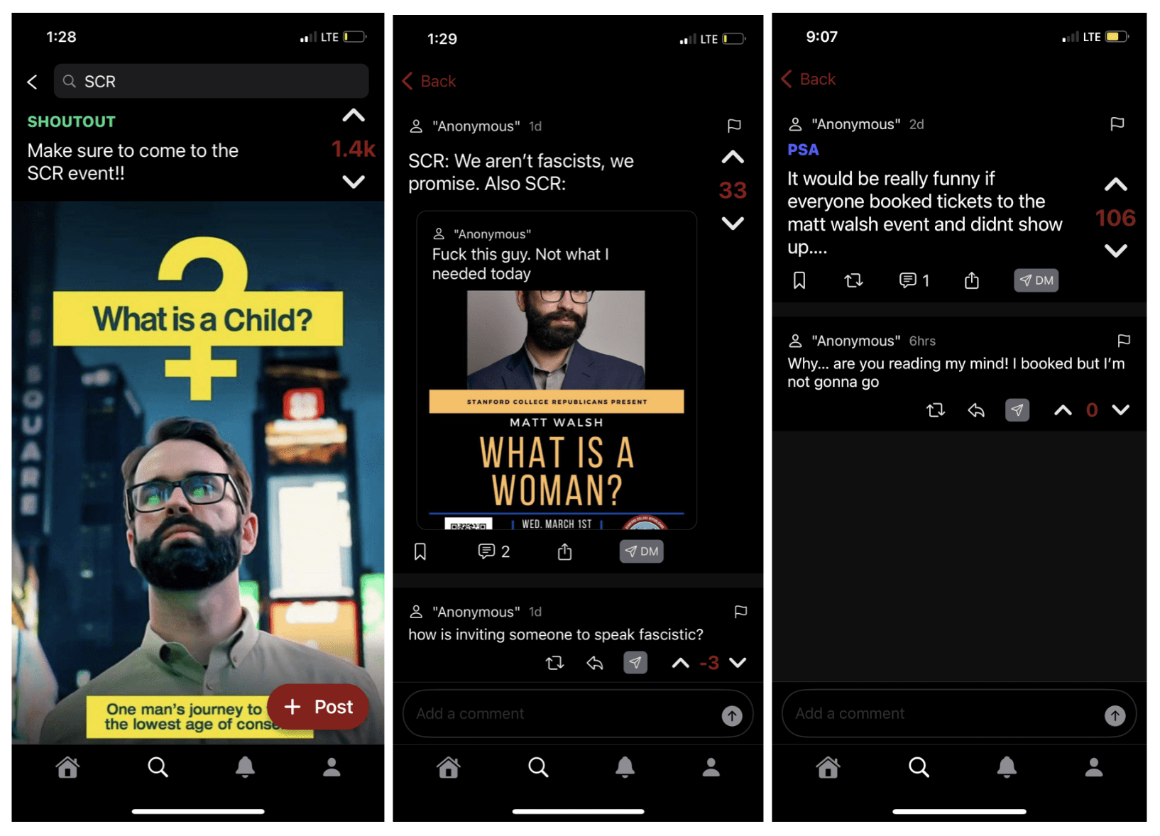 On Thursday evening, an anonymous person posted pictures of flyers promoting Walsh’s “What is a Woman?” lecture being burned to a Stanford social media forum.
