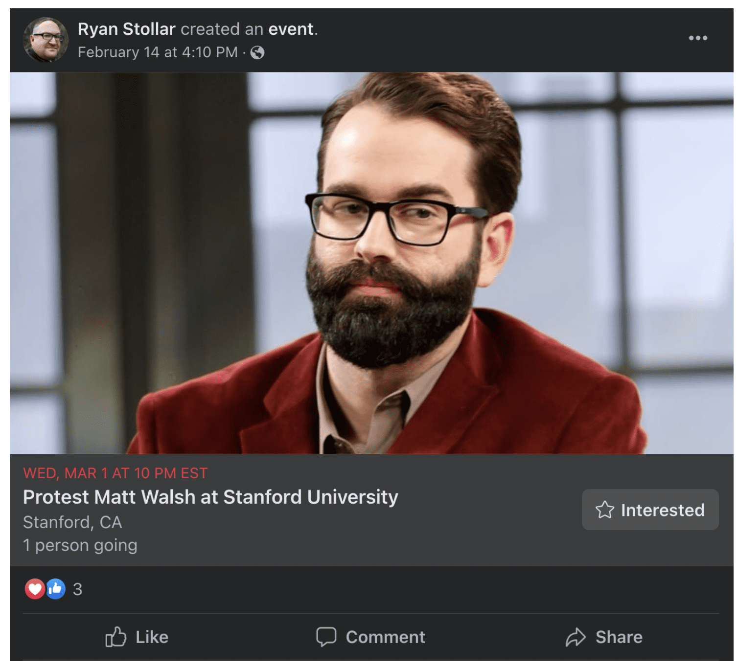 In the week since he created his protest event on Facebook, Stollar has only managed to gain one RSVP – from himself.