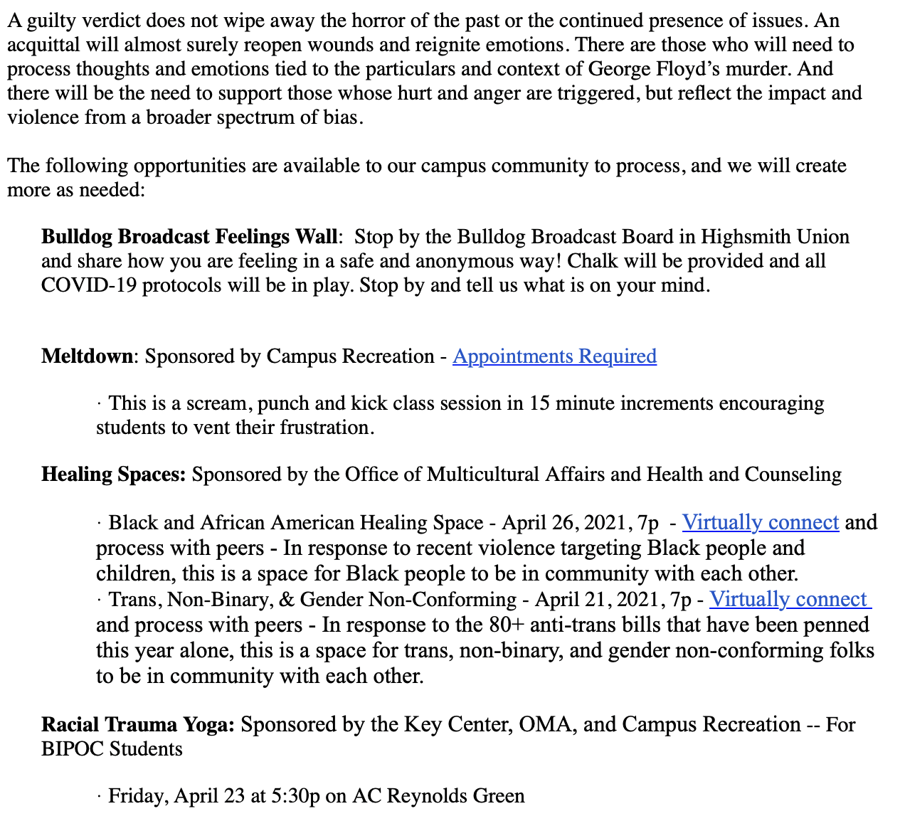 According to a university-wide email obtained exclusively by YAF’s Campus Bias Tip Line, UNCA Chancellor Nancy Cable claimed “recurrent deaths of black and brown people” and “anti-transgender legislation” have caused anxiety on campus. Cable promoted two “healing spaces” for students–one for “Black and African Americans,” and the other for “Trans, Non-Binary, & Gender Non-Conforming.”