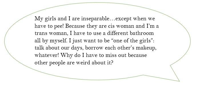 “My girls and I are inseparable…except when we have to pee! Because they are cis women and I’m a trans woman, I have to use a different bathroom all by myself,” one example states. The fictional male identifying as a woman in the aforementioned example goes on to complain that he can’t socialize in the restroom and borrow makeup from his female friends.