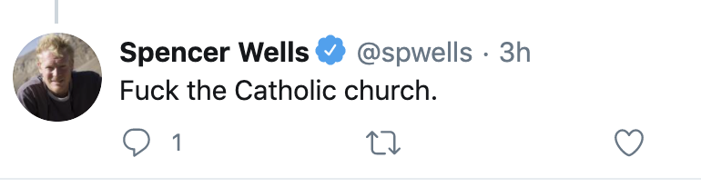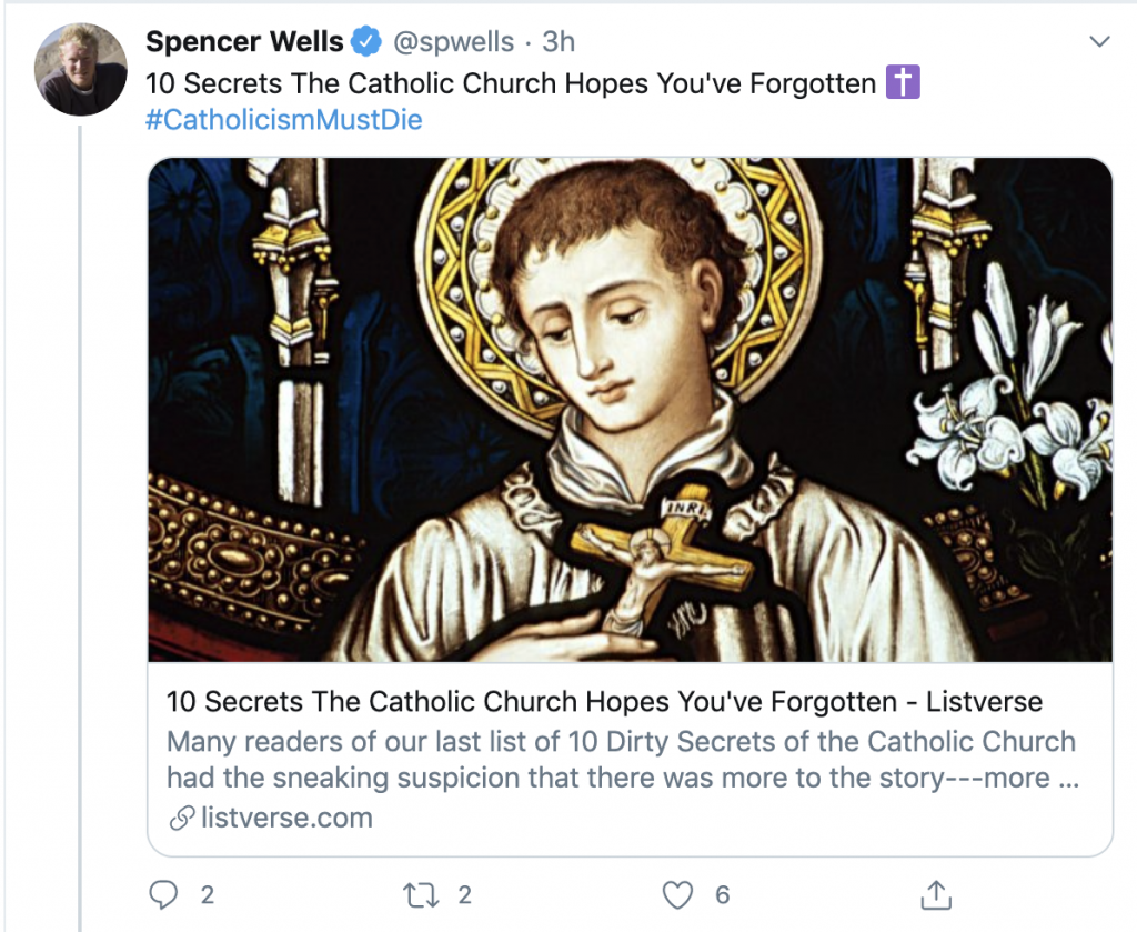 Wells also tweeted “F*** the Catholic Church,” and an article detailing “10 secrets the Catholic Church Hopes You’ve Forgotten,” with the hashtag #CatholicisimMustDie.