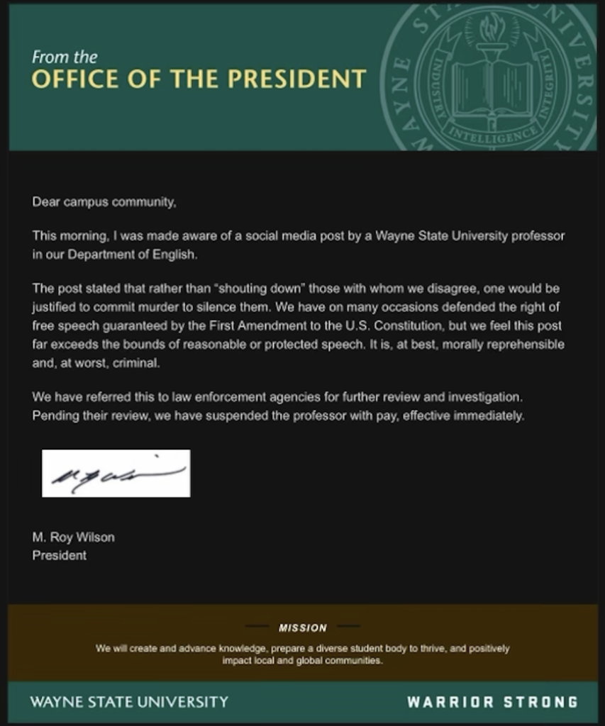 Wayne State Professor Calls for Murder of Those Who Express Opinions He Disagrees With